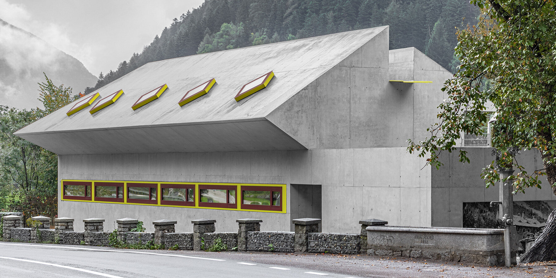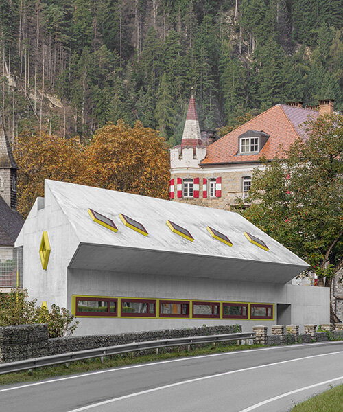 yellow diamond windows pierce angular concrete staff house by bergmeisterwolf in italy