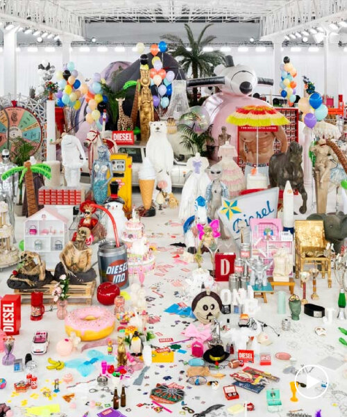 thousands of repurposed props, inflatables and memorabilia fill diesel’s runway show in milan