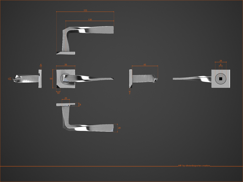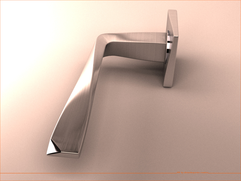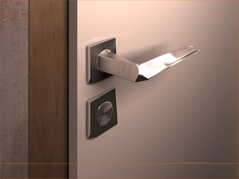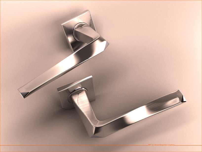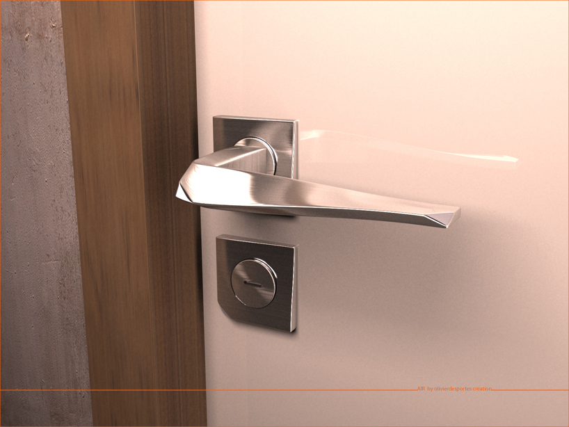 "air" arose from a set of twisting and from stretching of a material. the doors handle is realized in aluminum for its properties of manufacturing, injection and surface treatment. the brushed aluminum underlines the linear weft. the detail of the polished facets creates a break in the set of twisting of twisting of curved and clean lines.