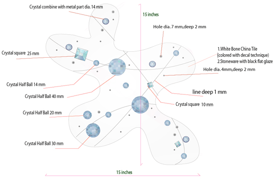 Andromeda : Jewelry wall tile with liquid shape in the space every pieces of crystal represent elements in universe that bright shiny all the time. Combination with line and holes with easy technique in ceramic surface decorating to make this tile strong and has many variation in decorating in many style of houses as a special one.