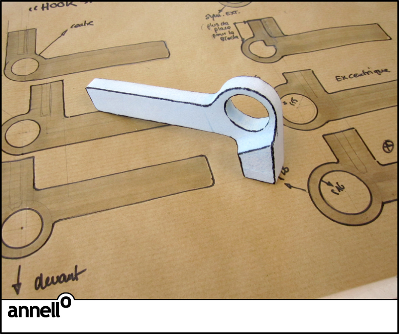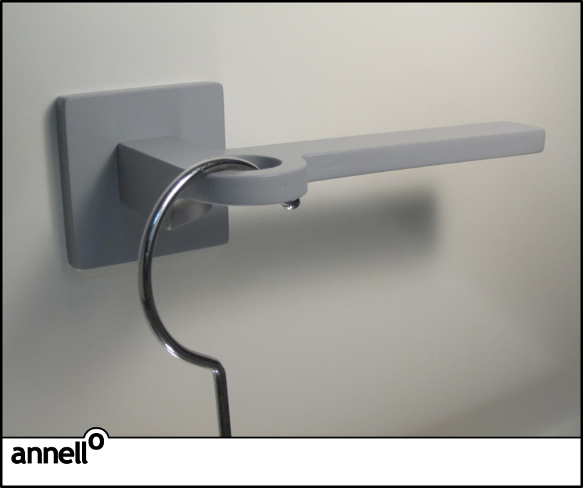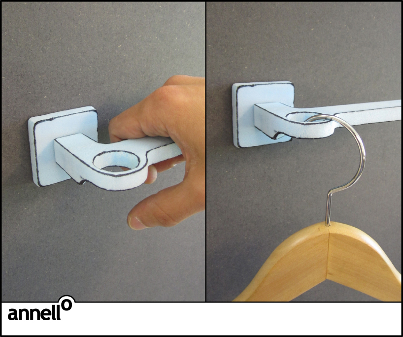 "annello" is a simple form with a ring to hang up a coat hanger or two behind the door. the handle is designed to work both verticaly and horizontaly which makes suitable for windows and doors. the ring part is placed in a way to be no bother for the hand.
