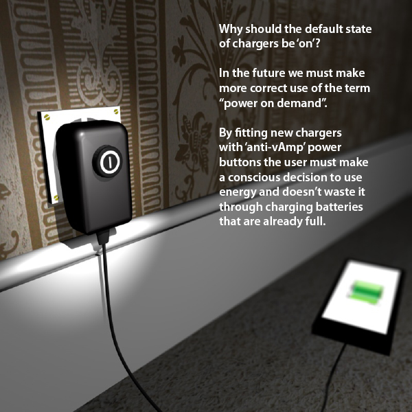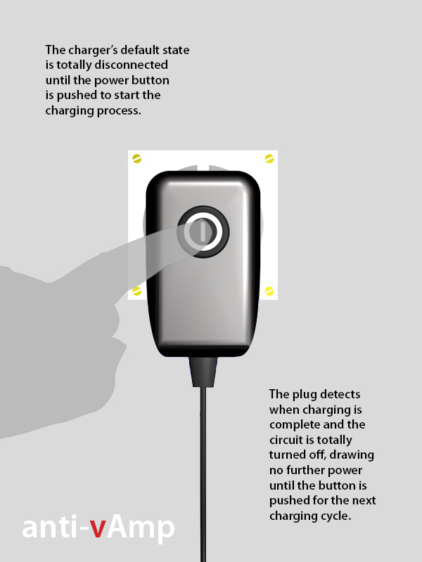 'anti-vAmp' takes the pressure off the user to remember to unplug their chargers, while reminding them of the power that they're using every time they press the button. Chargers can remain plugged in but in order to make them work the user must press the power button. This button is attached to a basic circuit that totally disconnects the charger from the power once the battery being charged is full. To keep power usage down the button is not illuminated, but painted to make it intuitively obvious to the user. Material usage is kept to a minimum to avoid simply replacing energy wastage with embodied energy in the product.