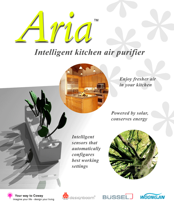 Aria - a solar powered kitchen air freshener. Plug in more Aria leaf stalks if you have a bigger kitchen space, or less stalks if you have a smaller kitchen. Running on solar power, the Aria leaves absorb kitchen smoke, ionises and purifies it with fresh smelling air. The solar panels are embedded on the other side, thus making the unit spae saving and independently operated. It's intelligent sensors allow automatic configuration, working doubly hard to clean the air when you cook, or runs on idle mode in other times. Its modular Aria leaf stalks allow more options to be added, and altogether, make your future kitchen, cleaner and fresher smelling. Aria - breathe fresh!