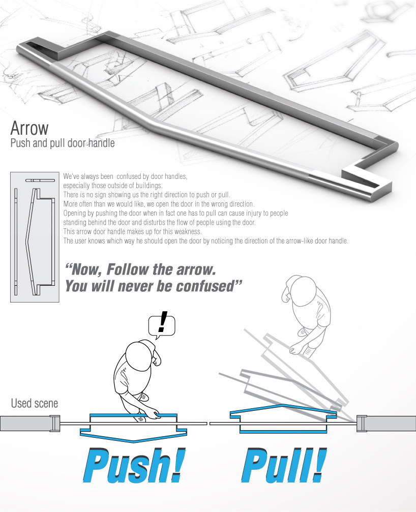 the user knows which way he should open the door by noticing the direction of the arrow-like door handle.