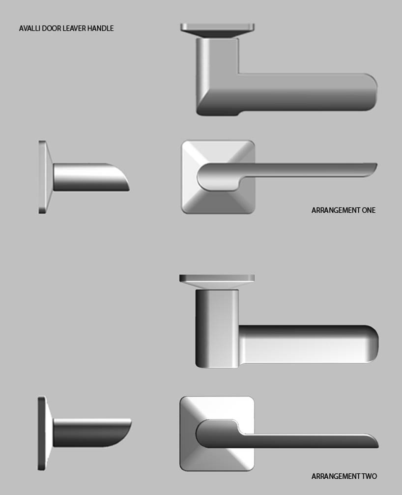 the avalli door leaver handle combines simple geometric shapes linked by smooth curving edges. it has a brushed steel finish but could also be chrome. avalli is in fact two door leavers in one, by flipping the handles upside-down and placing each one on the opposite side of the door the aesthetics are changed completely. This theory of multiple / reversible aesthetics helps to increase the range of handles colombo can offer with less manufacturing costs involved.