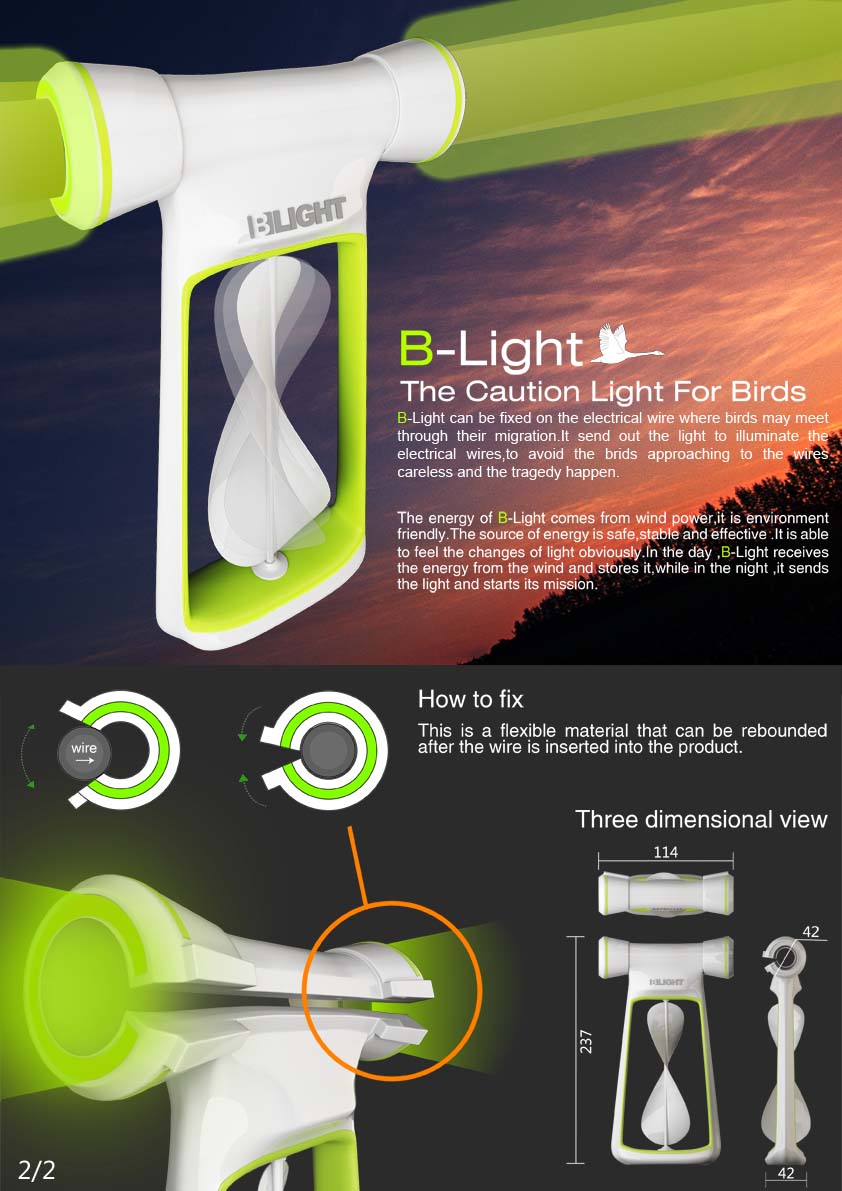 B-Light can be fixed on the electrical wire where birds may meet through their migration.It send out the light to illuminate the electrical wires,to avoid the brids approaching to the wires careless and the tragedy happen.