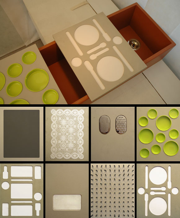 Out of a catalogue you can put together various functional small boards for your kitchen. They take on a lot of typical kitchen functions and yon can hang them up on the wall like pictures. For the different works in the kitchen, you put combine the fitting boards on the trough. For example we’ve designed a breakfast-board, a sushi-board, an induction-range-board, a drying-board, a grater-board, a bowl-board and so on.