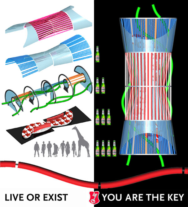 Live or exist, this means to live consciously in every moment, but also to praise coincidences. Everywhere in life are challenges; you constantly have to make a choice. In everyday life, we are used to navigate through common spaces without any surprises. If you enter the Beck’s Jungle, you will find a place for stepping aside, for celebrating life and sharpening the senses. As in life, you will not see the whole at the first glance; you will need to explore and to find out the rules. Break the rule, that is the rule. The Beck’s Jungle is the right place for everybody who is curious and ready to act, a spot for possibilities and encounters. The architecture itself reflects and simultaneously distorts everything around. The spatial concept consists of four key elements: Fluorescent PVC tubes wrapped with transparent textiles form The Skin. The tubes can change their colour randomly by means of LED lamps. The Snakes are foam plastic cushions fixed on different heights: Lean against and sit on them! Follow the paths through the keyholes and enjoy some distraction on various screens. The third element is The Shelter: Step on the lifted stage, take a beer from the bar and celebrate life! And, of course, the most important element: The Key itself ... the individual … you!