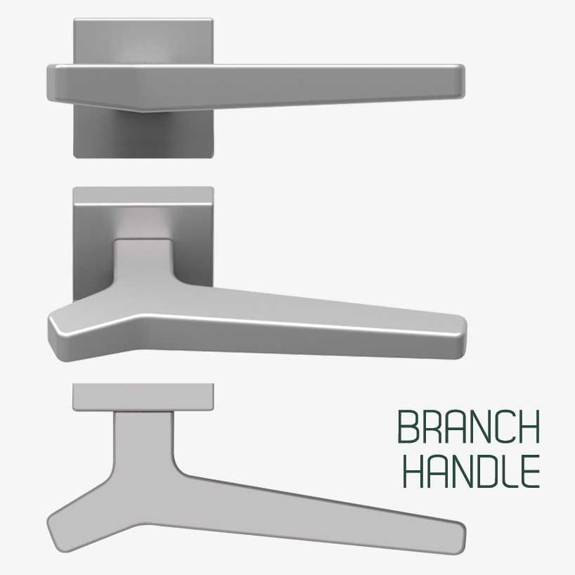 the starting point for this project is the declination of the branching concept, whether you think about the tree branch or the thumb of your hand. the handle recalls from the top view the shape of a branch, a natural reference which create an interesting contrast with the material of the handle. The lever is not exaclty parallel to the door; the second branch is the part that visually characterizes the piece.