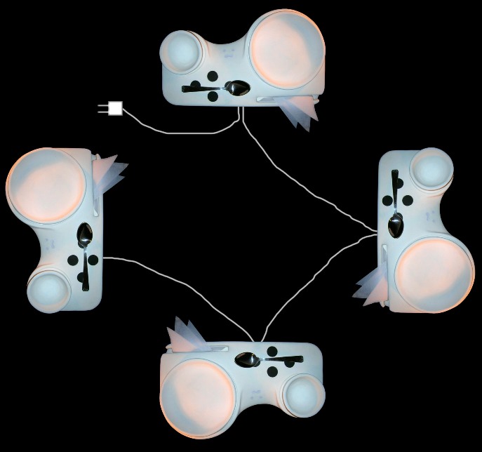 In the backside of the tray is the device to connect the electrical current and the device that permits a network of trays in sequence, so it can transfer energy to each other using only one electric plug. The electric plug of the tray and its extensions are removable, so it can permit more comfort and tidiness.