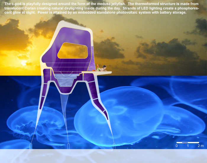 The c-pod is playfully designed around the form of the medusa jellyfish. The thermoformed structure is made from translucent Corian creating natural daylighting inside during the day. Strands of LED lighting create a phosphorescent glow at night. Power is attained by an embedded standalone photovoltaic system with battery storage.