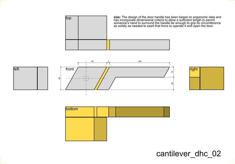 • size: The design of the door handle has been based on ergonomic data and has incorporate dimensional criteria to allow a sufficient length to permit someone’s hand to surround the handle far enough to grip its circumference as solidly as needed to exert that force to operate it and open the door.