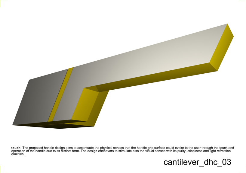 • touch: The proposed handle design aims to accentuate the physical senses that the handle grip surface could evoke to the user through the touch and operation of the handle due to its distinct form. The design endeavors to stimulate also the visual senses with its purity, crispiness and light refraction qualities.
