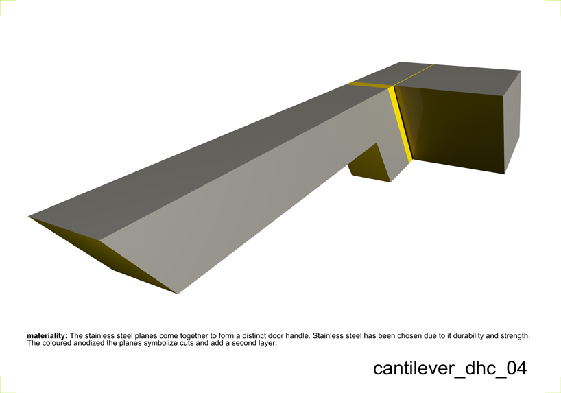 The stainless steel planes come together to form a distinct door handle. Stainless steel has been chosen due to it durability and strength. The coloured anodized the planes symbolize cuts and add a second layer.