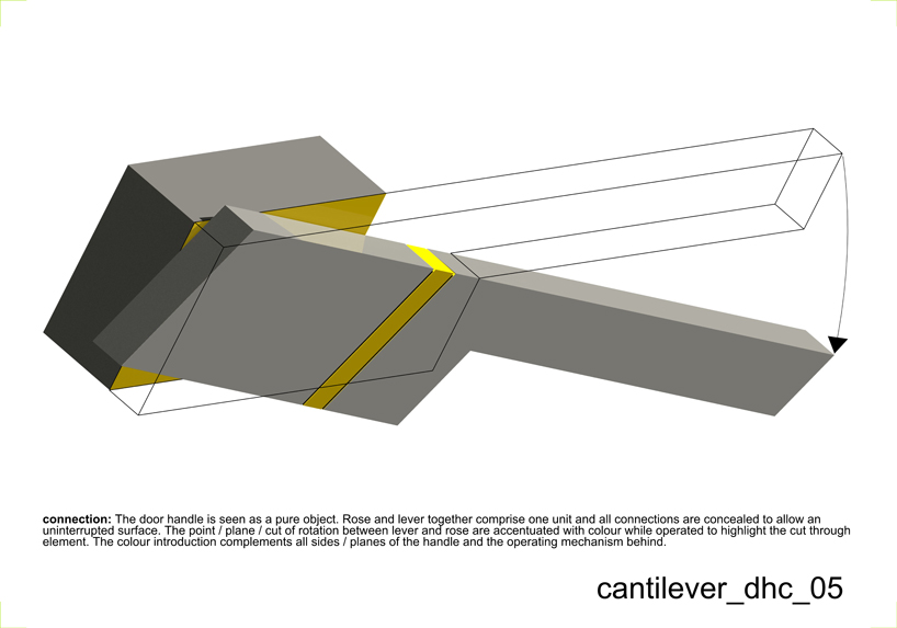 The door handle is seen as a pure object. Rose and lever together comprise one unit and all connections are concealed to allow an uninterrupted surface. The point / plane / cut of rotation between lever and rose are accentuated with colour while operated to highlight the cut through element. The colour introduction complements all sides / planes of the handle and the operating mechanism behind.