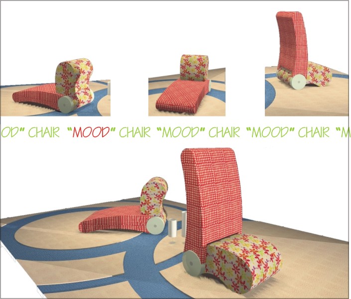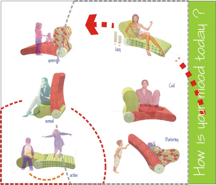 our design proposes one chair, which can be used as you wish, the user can change whit simple movements , the position of the seat back, the place in the room and even the function ,because you can use ,as chair, chaise lounge, bench or even a day bed, all in one just look