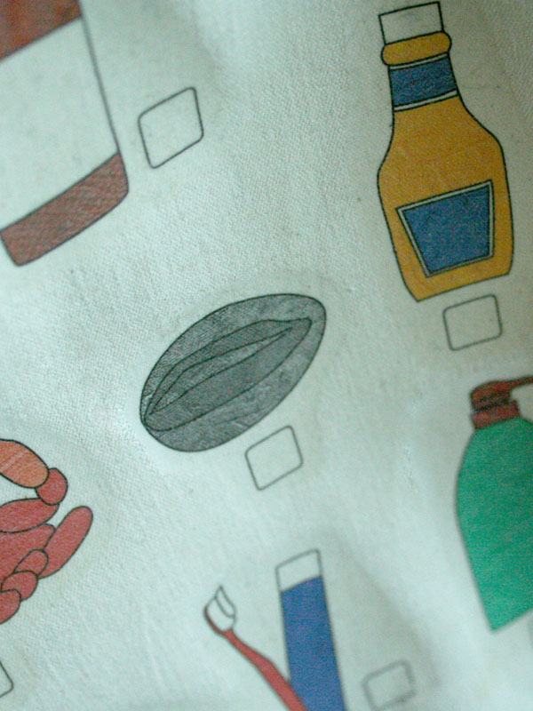 This product is a special shopping bag. On the outside of the bag, there are item lists you usually need for grocery shopping. Under the items, there are small boxes functioning as check lists. You can check the items that you need to buy for the day. By using this, the number of using plastic bags and paper will be reduced. The material is a canvas cloth to give an eco-friendly image. Other than that, acrylic paint has been used to give an impression that it was drawn manually.