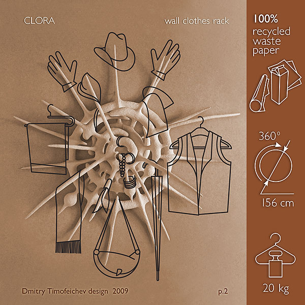 "Clora" - wall clothes rack. Real Eco+Art object. Dmitry Timofeichev (author) design. Made of 100%recycled waste paper (original "stone-paper" technology). 156 cm. diameter size. --- Category 1 - green design for humans.