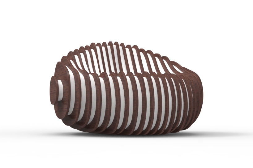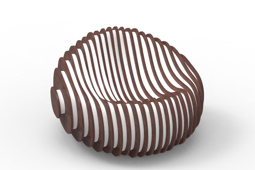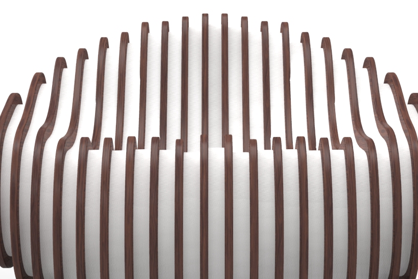 this armchair is made in two different materials. one goes for the thinner parts, that are mode from wood, and the other goes to the parts that attach the wood parts. they are made of soft material, giving a nice touch an feeling. this armcharis has an angle that makes you rest your back and is short so that you sit near the ground. that makes the user feel more confortable and secure. to attach one to another, the wooden parts have pins and the soft parts have holes.