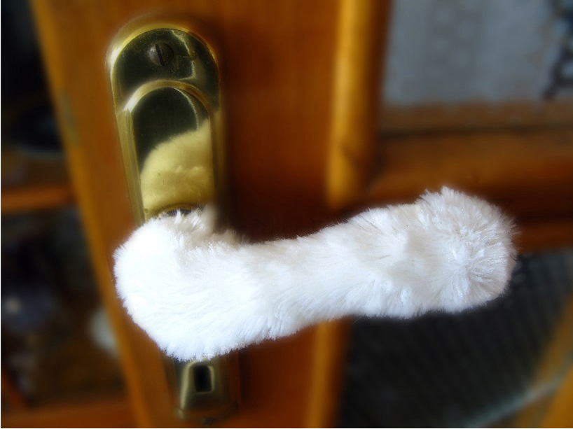 natural or synthetic fur, that provide a pleasant touch. The cover can be attached to different models of door handles, taking their shape. The inside surface of the cover has rubber inserts that provide adherence, so the cover remains fixed on the door handle.