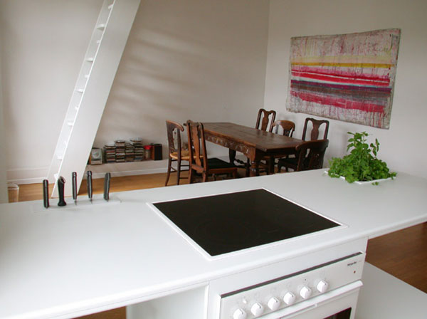 this kitchen system out of laminated worktop panels allows to respond to individual needs. through the special kind of the construction and the use of different base modules we achieved to offer a system, which differs from others by it’s aestethic and variety. the pictured version shows a freestanding cooking place consisting of two stilts and a cooker module. also it is possible to embed different insets in the worktop like here a ceran panel, a herbage- or a flowerbed as well as a knife holder. in this special situation we designed a kind of ‘cooking stage’, which opens up into the space in a communicative way. The design and material of the fitted kitchen in the background corresponds to the freestanding cooking place.