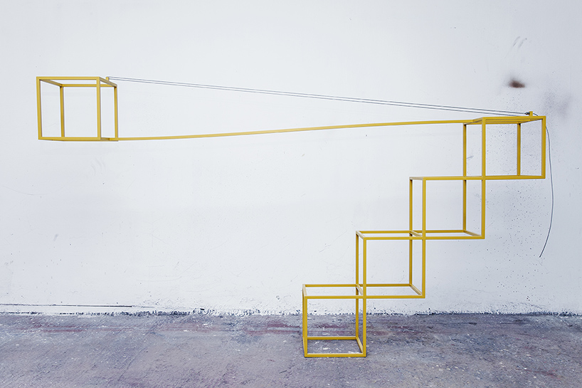 The Crane is a book library, inspired by scales and cranes. The first construction was a contour metal cube balanced by a cement cube. The weight element was later replaced by the books themselves.