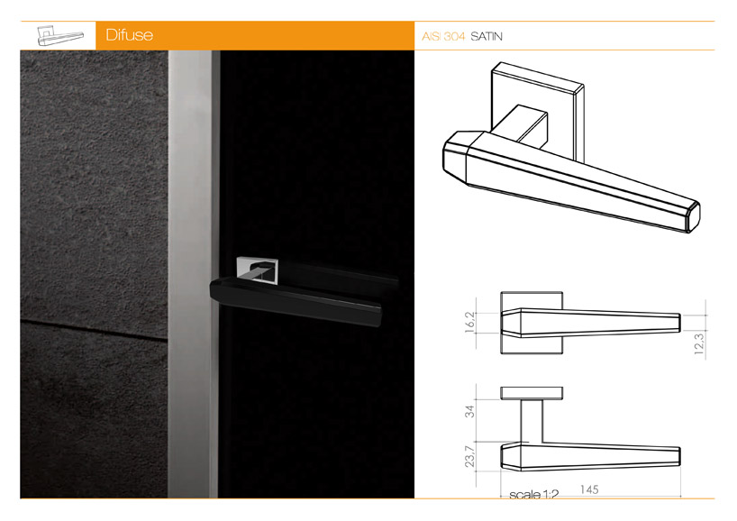 while conventional shapes are generally use in inside door handles outside architecture its exquisite risky fun and innovative. its on the following of this way of thinking i designed difuse. difuse main body would be made out of injected molded abs with a frosted look and would assemble to the main body though a fitting. on the to i would use an steel plate to achieve an contemporary and innovative look.