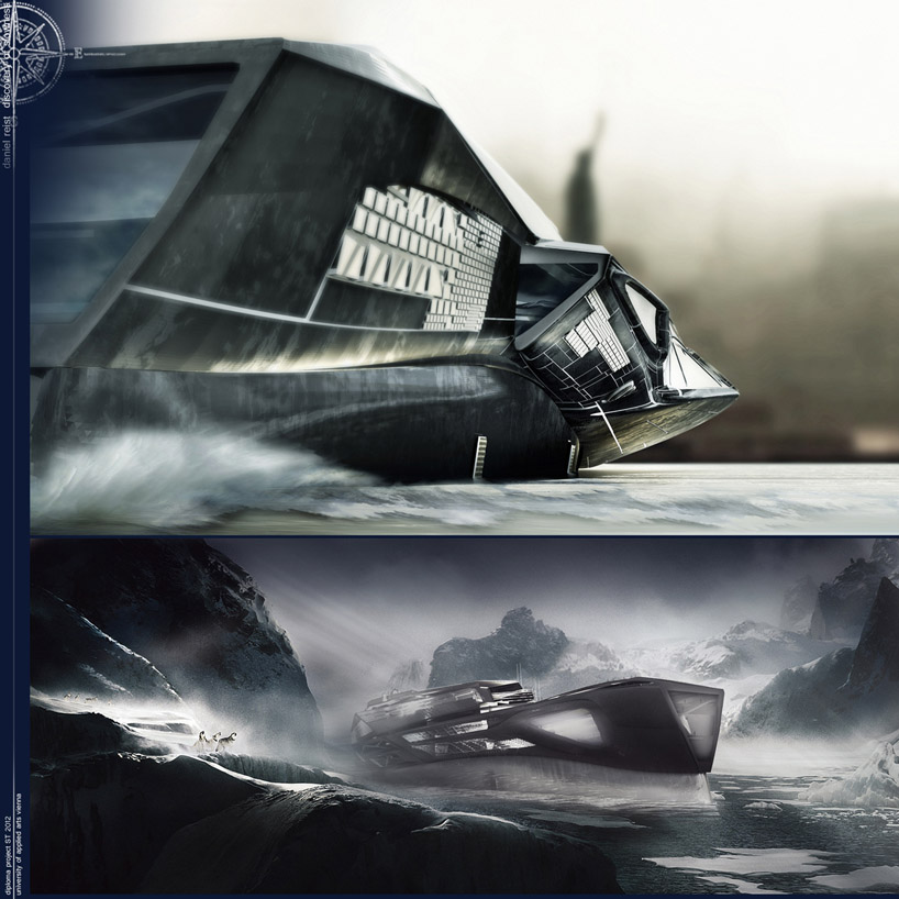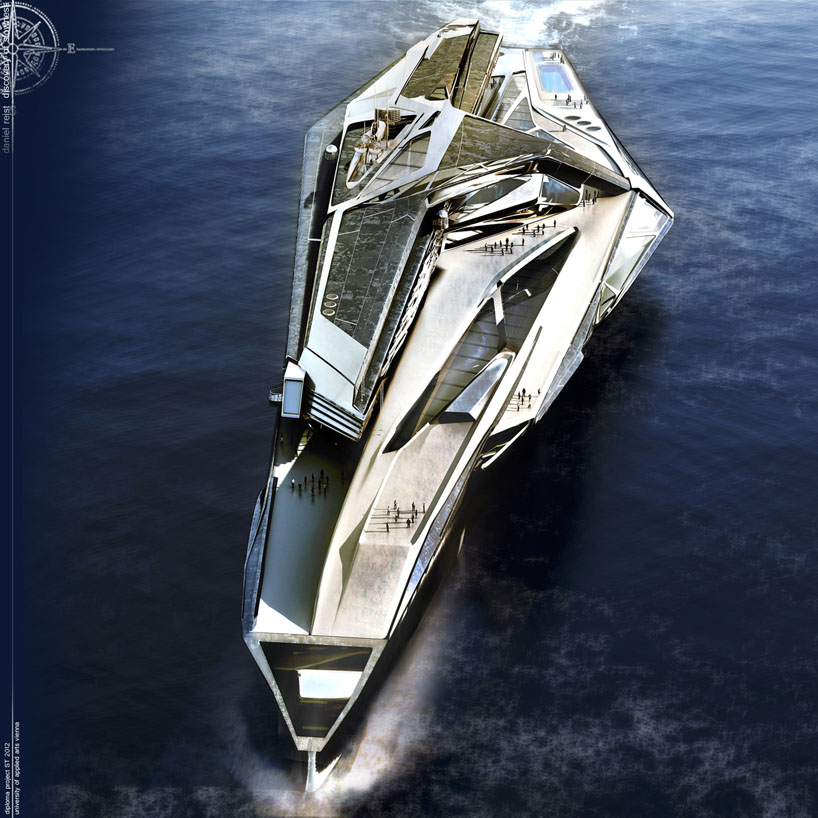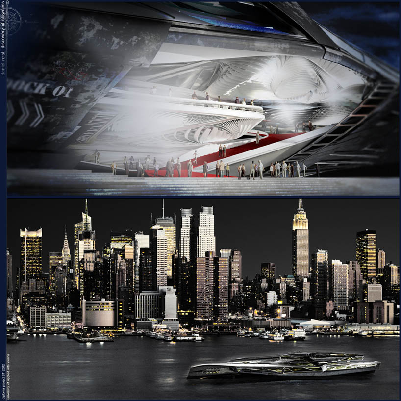 What is the definition of a building? Somthing that is built for human habitation. It can also be described as a structure that has floors and walls. But why should a building always stay at one place. Ships are one of the largest entities that human mankind has ever constructed. If we take the the aircraft carrier as an example. It is not just a ship, it is also a hybrid of programs, a connection between air and water. Hans Hollein was referring to the spatial performance of this vessel in his project "der Flugzuegtraeger in der Landschaft". Besides the Aircraft carrier as ship typlogy I want to mention one special vessel. The SS Normandie for me is really interesting. The designers decided to create a huge open space in the center of the ship to provide space for events, concerts and performances. So they decided to make the planning and the construction of this ship more complicated to achieve more spatial quality. One of the basic ideas of my project was, in times where everything has to be fast and optimized, to create an entity the creates its own time, inspired by the book of Stan Nadolny (the discovery of slowness). Another main Idea of this project is to create a new sustainable way of travelling. The vessel is fueled with hydrogen, that is produced by the ship itself with solar cells on its surface. When the ship is interacting with an urban environment, the ship is charging itself and produces hydrogen. To cover port costs the main event hall in the center of the vessel can be rented out. All these parameters were influencing the design process and were leading to the resulting ship typology. This object should be able to bring events to different locations and also provide space for political happenings like the G8 summit. All in all this project is not a simple cruise ship, it is a multifunctional envelope that is independent of any location in the world. It can work totally isolated or interact with city environment to extend the urban space.