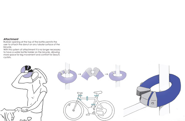Water bottle in the shape of a donut, adaptable to all bicycles. Due to its shape and the plastic opening, the donut can be attached anywhere. An easy sliding filter system incorporated in the bottle, filters Seoul's tap water to have fresh and clean water anytime, anywhere.