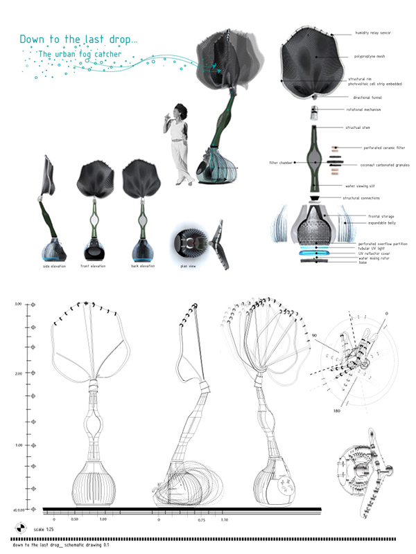 The ‘Down to the Last Drop’ Urban Fog Catcher aims to harvest humidity in the urban cityscape of Incheeon Korea and supply purified drinkable water.
