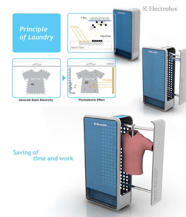In year 2020, there will be a global shortage for water. “Dress Manager” is a future-oriented washing machine which operates by static electricity and photoelectric effect of lights.