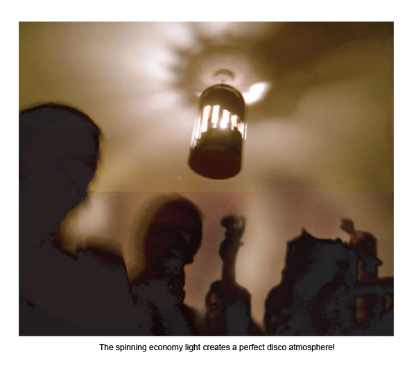just like an expensive disco ball. an intergrated solar panel is mounted under the lightbulb, powering a motor which spins the outer light shade. the holes in the outer shade let the light escape when they are lined up with the inner shade, creating a flashing spiral pattern on the ceiling and walls. simply switch on the room light to start the party light and let the dancing begin!