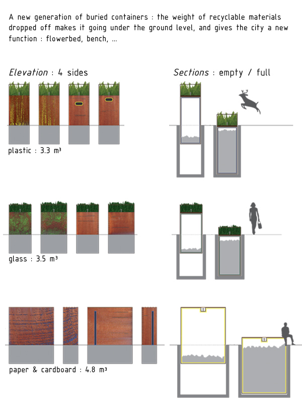 The massive elements gradually disappear under the ground level due to the weight of recyclable materials dropped off by the citizen. In return, once a container is full, it gives the urban space a second function : indeed, it turns from massive element to bench or flowerbed.