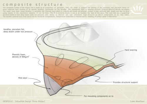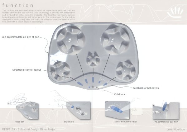 Gas hobs have always been frustrating to operate and difficult to clean. The Fingers hob design aims to make cooking using a gas hob a more pleasurable experience. The concept design uses touch sensitive technology to control the hobs and its controls are laid out in an intuitive manor. The surface is formed by deep drawing Keraflex porcelain foil and then supported by phenolic foam. The appearance model was sponsored by The Hothouse (A design centre for the ceramics industry) and has received commercial interest from the British Design Initiative.