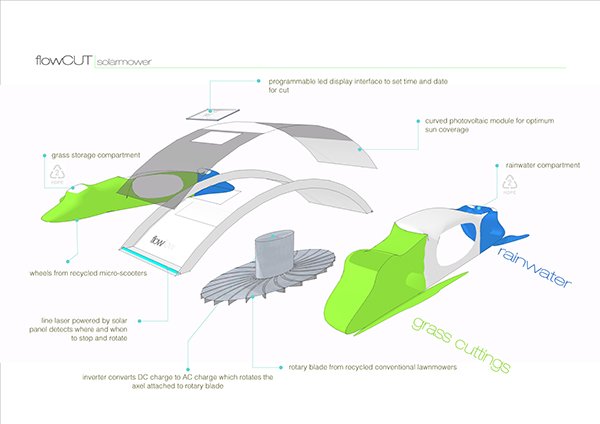 Had enough of pushing a heavy lawnmower across your back garden when you have better things to do with your weekends? The flowCut solarmower tackles this laborious task by using sunlight and rainwater. All you have to do is leave the flowCut on you're lawn, let it soak up the sun, and the photovoltaic panel will power the engine and rotary blade, allowing you to put your' feet up. The flowCut detects when to turn and stop with the use of a laser sensor at the front and rear. It also tackles the task of feeding the lawn by collecting rainwater in a compartment filled with natural grass nutrients... With the flowCut solarmower the grass is always greener!
