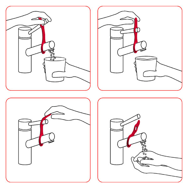 Often water is running when people brush their teeth or have a shave. »flowstop« is attached to your single lever bath tap. After you used the tap it moves the lever back into its original position. As a visual signal it helps you avoid wasting water you do not need. If you want to wash your hands you just take »flowstop« off the lever. »flowstop« is made of rubber and is available in several different colours. With »flowstop« you can reduce water comsumption by 1,000