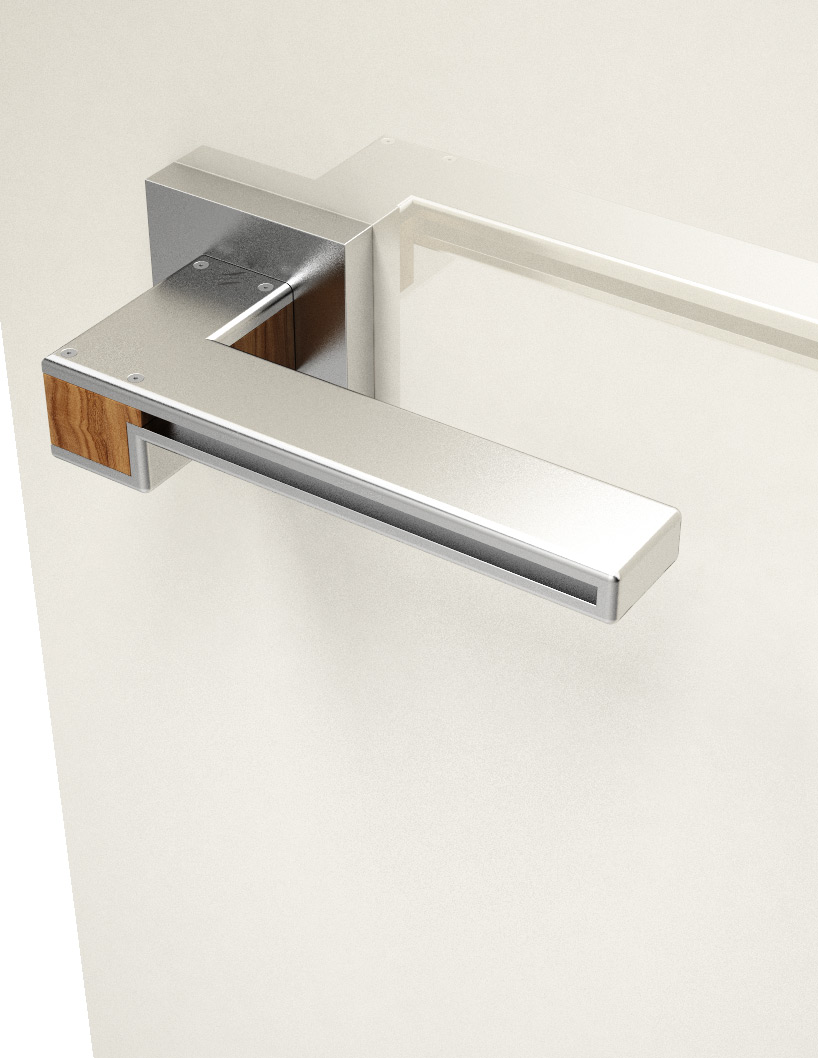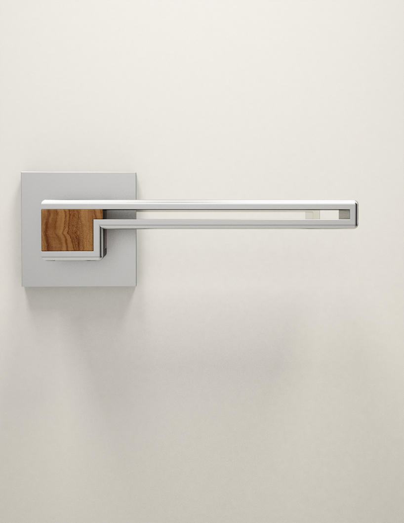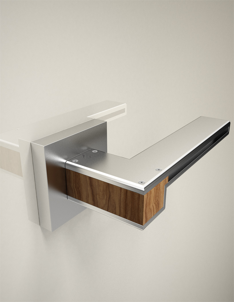 the form emphasizes the mechanical coupling between the two materials. the act of gripping the handle further reinforces the gesture of the folding stainless steel encapsulating the wood.