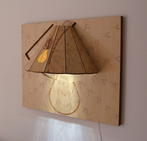 In addition to origami, my inspiration for this work originates from nomadic living in small apartments, resulting in the continual reorganization of my own personal space. The compact nature of the lamp in conjunction with other furniture pieces I have created provides more open space and promotes an efficient use of a small living environment. This allows a small space to be in constant flux; transforming from one activity to the next throughout the day as furniture is taken off the wall, used, and put back into its frame. I am passionate about environmental conservation; I choose to take up less space and create less waste in my personal life and in the work I create. My furniture is designed in Rhino, laser cut out of sheets of sustainably harvested plywood with minimal material waste, assembled using eco-friendly adhesive, and sealed with water-based finishes. The flat-pack aspect of the work suits a mobile lifestyle for those who move frequently while reducing the cost and pollution associated with shipping and relocating.