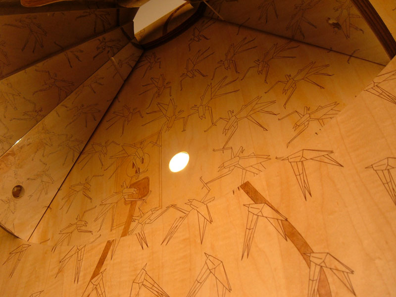 Folding Mosquito Lamp is a furniture accessory with a dual function. When the lamp is not being used, it hangs on the wall as two-dimensional composition on maple veneered plywood with laser-engraved images representing a central array of almost-completed origami mosquitoes as if they were in mid-fold. These purple-colored mosquitoes appear in a repeating scaled pattern as if they are being drawn to the image of a light bulb in a socket on a hanging cord which droops down and back up within the plane, disappearing behind a slice in the wood. A switch at the bottom reveals a light source behind the veneer which gives off an ambient glow. Pulling on the chain at the front of the lamp exposes geometric planes of the lamp which fold outward, completing the front half of a lampshade. The remaining image of the drooping cord completes the base shape of an iconic lamp form. Fully unfolded, the LED source gives off more light as it reflects off the mirrored surface on the inner planes. The exposed graphics underneath the “shade” display the end of the cord in an electrical socket and the transformation of the origami mosquitoes to their completed folded form. The “shade” planes hold their structure with the use of magnets and bungee cord tension running through channels within the wood planes. After use, the planes fold back into the wall frame with ease in a fluid motion.