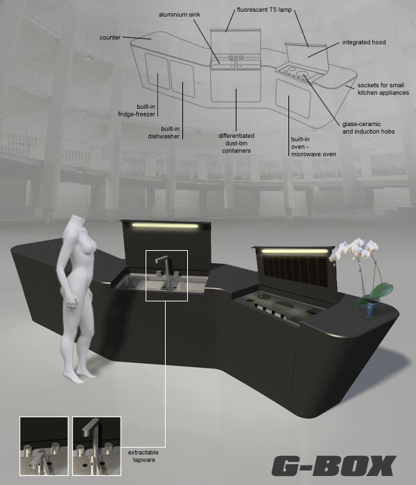 The G-BOX contains all essential built-in kitchen appliances, that can be easily hidden when not working, offering a broad counter that can dispatch addictional functions like table and buffet bench for parties with friends.