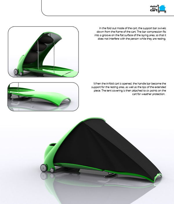 This sleek and compact design provides several separated storage compartments and a covered resting area for weather protection. The front storage compartments can be easily accessed by the slide down doors on the front. The weight from materials in the storage areas is balanced by the weighted wheels at the base of the cart. In the fold out mode of the cart, the support bar swivels down from the frame of the cart. The bar compression fits into a groove on the flat surface of the laying area, so that it does not interfere with the person while they are resting. When the tri-fold cart is opened, the handle bar become the support for the resting area, as well as the tips of the extended piece. The tent covering is then attached to six points on the cart for weather protection.