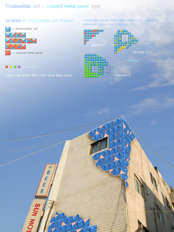 This is pre-fabricated photovoltaic façade system for old buildings’ facade. There are two types of modules, 'pv cell + metal color panel' type and 'pv cell + glass' type. One module consists of 4 triangular compartments, and each compartment can be photovoltaic panel, colored metal panel or glass. The users can create their own pattern by selecting different colors and compartments according to their own needs. The combined modules can be attached to any existing building’s façade. This new layer of façade produces electricity during the day time and stores it for latter use, for example, signboards and lights for the night time. Moreover, the three dimensional pattern and various colors give a splendid look to the old & boring buildings. This is not only power generator, but ornament that vitalizes the urban context.