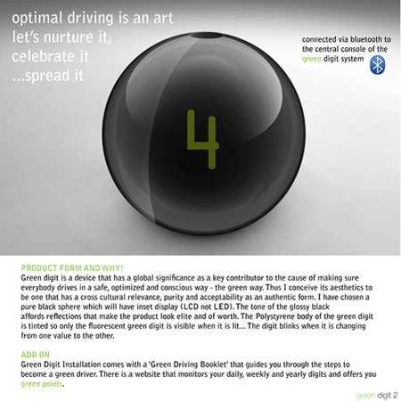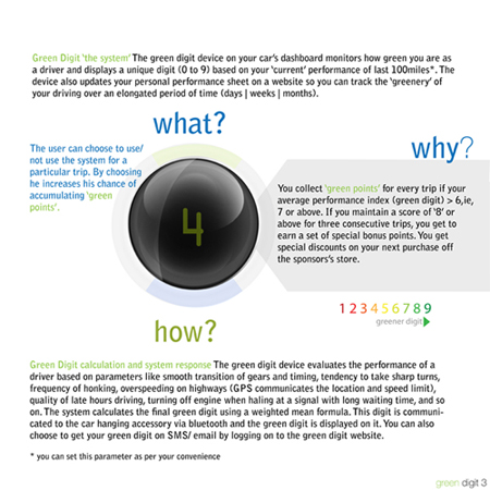 green digit is a system that inspires you to drive in a way that is green. green is not only about non polluting your environs. In the coming years, the definition of green will include an overall harmony between your actions and the environs. green digit judges your driving performance based on certain parameters relevant to fuel optimization, safety of others, road etiquette and human behavior and displays a single digit between 0 and 9. This corresponds to how green a driver you are.You earn green points if you maintain your green performance and stand to win discounts off sponsor's outlets.