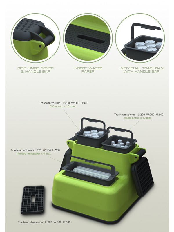 Convenience is a main issue for eco-product. We have to make effort on it to blend with our surroundings. Green Trashcan is a distinct design on this base. It provides a way to well organize the recyclable stuff. And it is designed as a ladder which can be enhanced the convenience for the user.