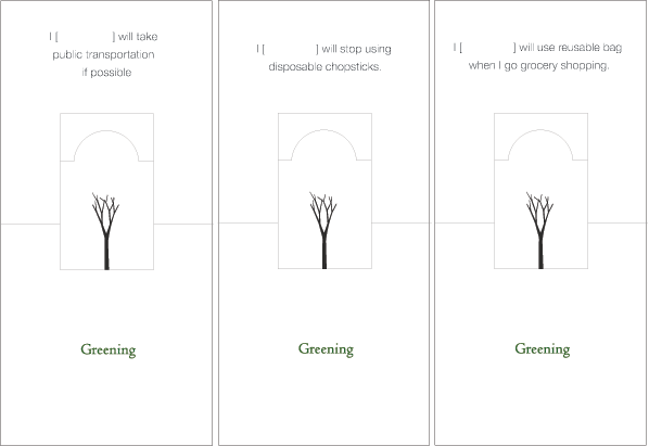 *blank will be filled with person’s name. Second, the image of the tree which is completed by stamping the fingerprint represents that the promise and the execution of the phrase can save the tree (the nature). The completed pop-up card will play a role as reminding eco-friendly behavior in people’s daily lives as well as a design piece with decorative purpose.