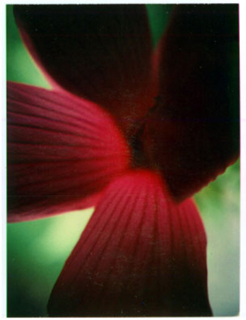 to mention flower photography first would be like putting the cart before the horse. the origin of hanayo begins with my desire to take large format photographs. i reasoned that a 'real' photographer is capable of taking great photographs in all formats. after my ignorance of the economic realities of large format photography faded, my artistic desire remained. this lead to the decision to use polaroid instead of conventional 4x5, 5x7, or 8x10 film. in searching for 4x5 polaroid back cameras, i came across the oscilloscope camera. for the uninitiated, an oscilloscope camera is a highly specialized camera designed to photograph the screen of an oscilloscope. the lens' depth of field is designed to be extremely narrow so that only what's on the screen is in focus. what this means is that, for any given subject, only one portion will be in focus and the rest which is only a few millimeters away will appear to be distant and out of focus. because of this, the most suitable subject that came to mind to experiment was flowers. when i first shot hanayo in black & white, the results were so abstract that even i could not tell what i had photographed. color became necessary to provide representational information and the need for a flexible exposure range culminated in polaroid 679 as the film of choice. returning to the subject of flower photography, almost all fine art flower photography i had seen involved still life (dead, cut flowers), studio photography with a cloth backdrop, or some combination thereof and they often fail to capture the essence or 'life' of the flowers. photographically, i was initially inspired by karl blossfeldt, but the oscilloscope camera produces photographs whose conventions are diametrically opposite of his. blossfeldt's photographs are highly formal and his plants don't look alive. generally speaking, i think paintings and drawings capture truths about flowers more successfully than photographs do; the flowers are always lively. while my initial photographic inspiration was blossfeldt, my artistic inspiration was jakuchu. i've had a book about him since 1990, and i've always admired and envied his eternal modernity, radical composition and use of space. in another jakuchu inspired idea, i even wanted to present some hanayo photographs on kakejiku (hanging scrolls). this is known as shashin no kakejiku and dates from the meiji period. digital processes have made shashin no kakejiku more feasible than when i first considered the idea but, unfortunately, i did not pursue it. one lesson that can be learned from these photographs is that there is no up, down, right or left; the only direction is towards the light. the radical compositions and unfamiliar scenes in the hanayo series are primarily the result of the flowers' ruthless orientation towards the sun.