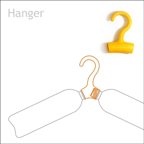 The product turns two plastic bottles into a clothes hanger by screwing the bottles into the hook.
