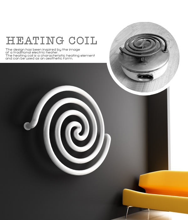 The design has been inspired by the image of a traditional electric heater. The heating coil is a characteristic heating element and can be used as an aesthetic form. Steel varnished bent tube.