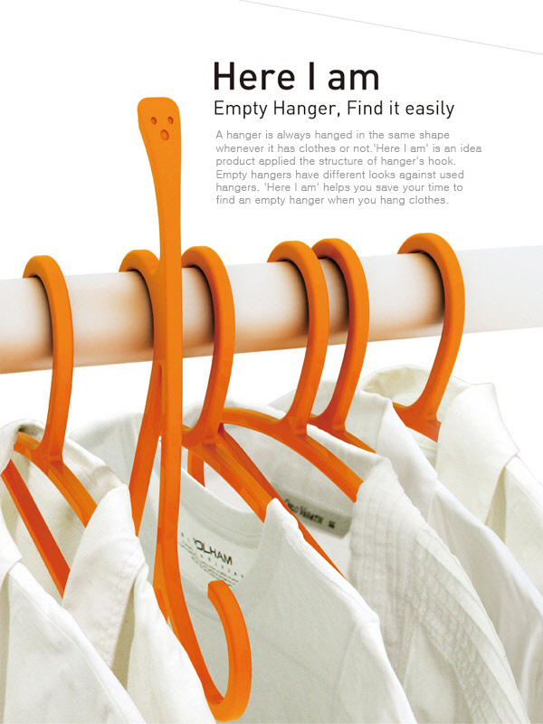 A hanger is always hanged in the same shape whenever it has clothes or not. So, we often have difficulty finding an empty hanger hided among clothes. 'Here I am' is an idea product applied the structure of hanger's hook. Empty hangers have different looks against used hangers.