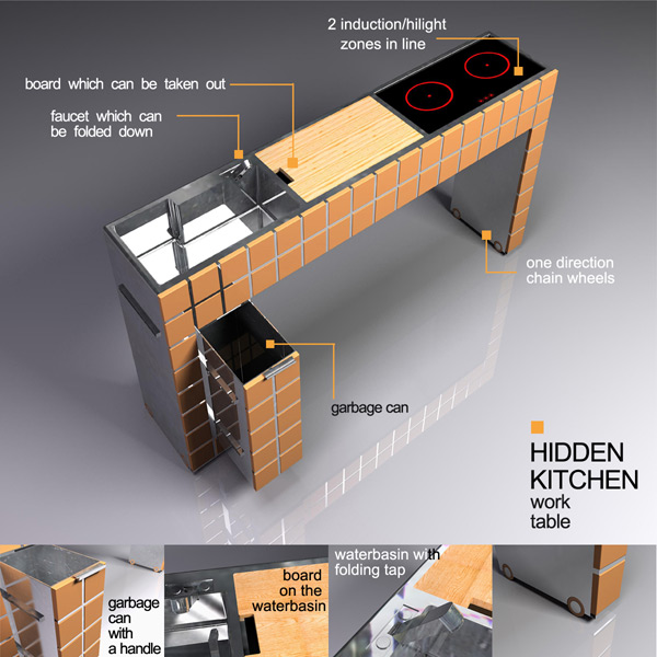 The form of hiding conveys a sense of satisfaction for only the owner knows exactly where all the things are. There are an increasing number of people in our planet so our living room is reducing. However, the room inside our heart has been in great demand nowadays. Therefore, we need such a product to protect our privacy and save the room. Hence, we gave the name Hidden Kitchen to the design. All the kitchen functions are hidden in the wall behind our vision when the kitchen is not in use. Furthermore, users can change the pattern of the tiles according to their interests and the arrangement of the kitchen. That is an fascinating course which can add some colors to the room.